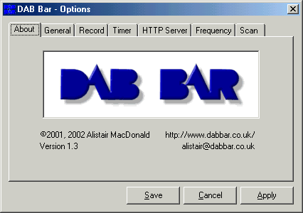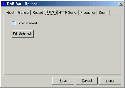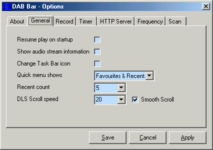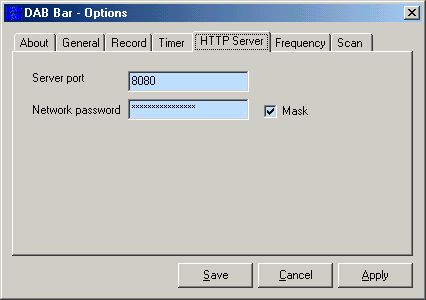 HTTP Server OptionsThe HTTP server allows third party players such as WinAmp, Zinf (formally FreeAmp), Real Player and Quintessential Player on the same machine as DAB Bar is running, or across a LAN. The stream is sent using the ICY protocol so any ShoutCast/IceCast player can be used. An HTTP compatible interface will also allow Windows Media Player 6.4 to be used with a few quirks.
