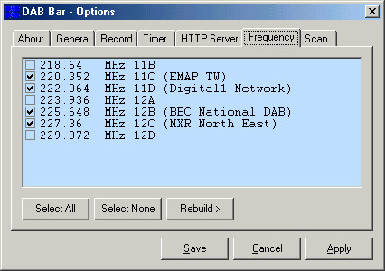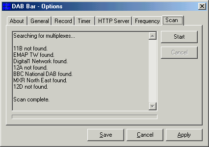 When DAB Bar is run for the first time it will build a standard list of frequencies available in the UK and you will need to do nothing. If you live outside the UK then you will need to rebuild the list. You can do this by clicking the "Rebuild" button. Then select "Band III and L-Band" unless you live in Canada where you should select "Canada". Clicking the check box to the right of a frequency will toggle if the service is included in the scan operation. This can be used to speed up the scan process by not scanning frequencies on which no service will be present and also prevent phantom services appearing from neighbouring areas where the signal is not strong enough to listen to. ScanThe scan tab allows you add new services when a new multiplex becomes available in your area, or to remove a service from the list that is no longer broadcast.
