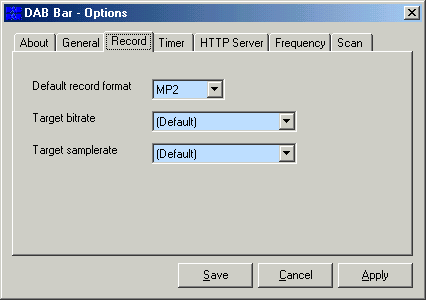 The DAB Bar Recoder is used to save recordings to formats other than the DAB native MPEG Layer 2 (MP2). The recorder requires some third party libraries to function that are not included in the DAB Bar distribution but are freely available on the Internet and can be downloaded from the DAB Bar web site. The File formats currently supported when the relevant libraries are installed are MPEG Layer 2 (MP2), MPEG Layer 3 (MP3), Ogg Vorbis (OGG) and Windows PCM (WAV). The Target bitrate can recommend to the Recoder how you would like the audio to be encoded but there are many invalid combinations, and this will vary service to service. As a result the Recoder can ignore an option and will take a best guess at what is required. Target samplerate only affects MP3 recording, all other broadcasts are saved at the transmitted sample rates of 48000 or 24000 KHz.