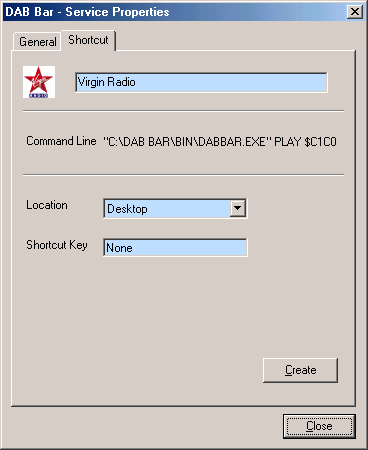 Clicking the "Shourtcut" tab will enable you to create a Windows shortcut to start playing a service and to get a command line to enable thitrd party application to control DAB Bar.