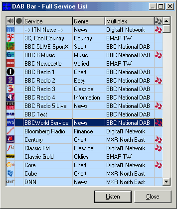 Listed are all the services that DAB Bar has detected. The list can be sorted by service name, genre (service type) and multiplex name by clicking on the desired column header. Clicking on the the icon in the right hand column will play/stop playing the service without closing the list window. This can also be done to the highlighted service by tapping the space bar. The next column indicates if a service is being recorded, clicking in this column will toggle recording of this service. Clicking the "Listen" button will play the service that is selected and close the window.